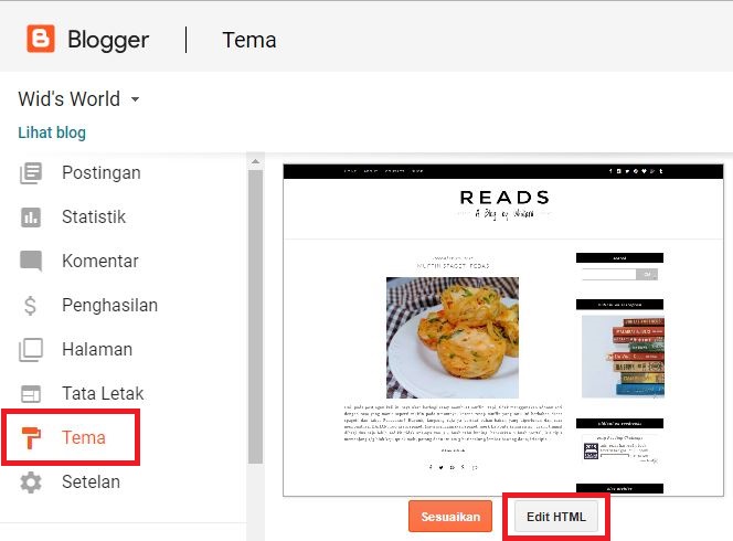 4. Setelah memiliki widget Arsip Blog, langkah selanjutnya adalah memasang scroll bar dengan cara: klik Tema ---> Edit HTML